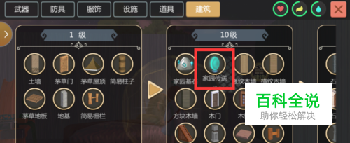 【图纸】的页面,在“建筑”这一项,10级里面找到“家园传送器”。