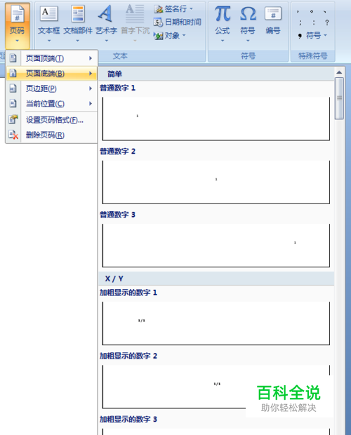 在“页码”项里的下拉菜单根据需要选择选择需要的页码类型,这里举例选择“页面底部”,会弹出下拉选项可选择一种。