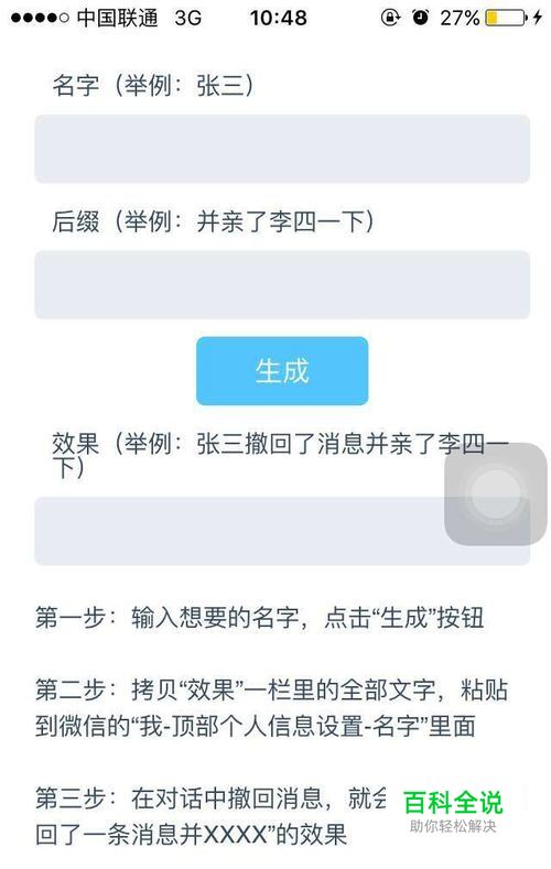 网页里有很清晰的教程,第一步输入你的名字,也可以是你的微信名字,然后在后缀里写上:并亲了**一下,并打了**一下等等,然后点击生成,此时在效果里会生成一个新的名字。