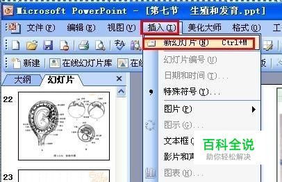 方法2:打开PPT编辑窗口——点击菜单栏“插入”——点击“新幻灯片”就OK