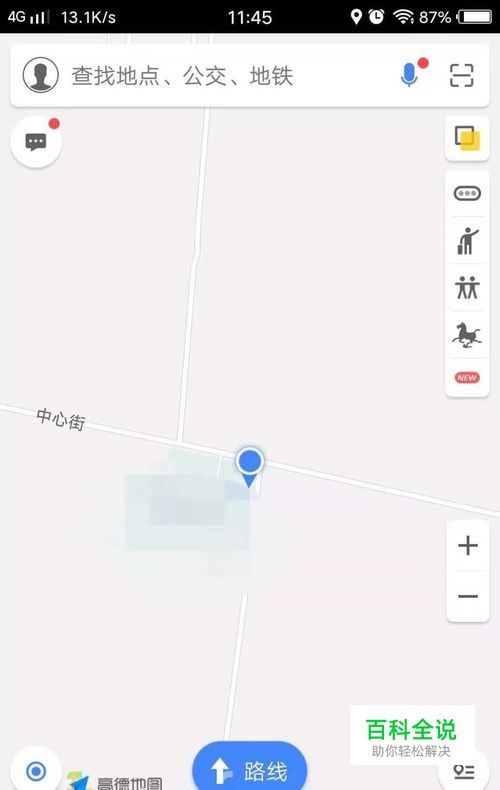 打开高德地图,进入地图页面。页面显示当前位置同时显示“路线”设置按扭。