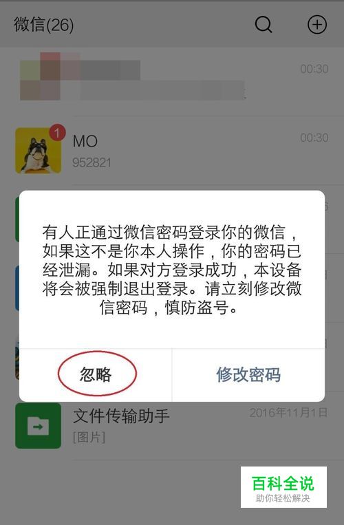 登录微信后,会有以下页面,点击【忽略】就可以成功进入微信了。