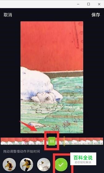 选择“慢动作”,拖动绿色滑块,确定开始慢动作的位置,慢动作持续时间:滑块在起始位置为0-6秒;中间位置:前3秒加后3秒;末尾位置:结束前6秒,确定后点击“保存”。
