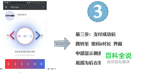 支付成功后跳转至密码时常界面,中部显示充电时间,底部显示密码