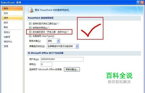 这里我们需要使用开发工具选项,一般office在默认安装的情况下是没有显示的,我们先要把它找出来:点击office图标——》ppt选项,如图所示。