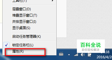在任务栏上面单击右键,选择“属性”单击左键