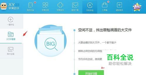 进入手机体检选项窗口后,我们点击“大文件管理”,并点下”开始扫描“按钮。