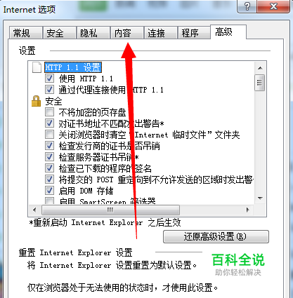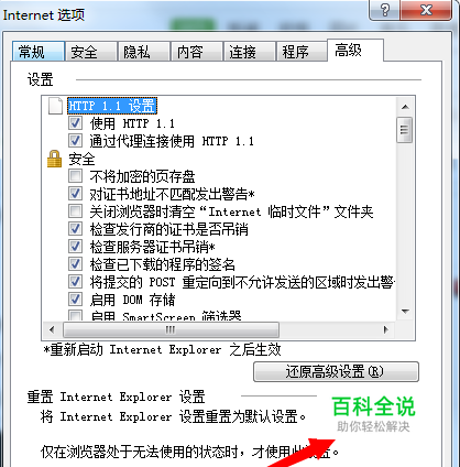 在高级选项下可以看到重置IE浏览器,点击后方的 【重置】