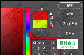 首先,来看下色相。我们调出拾色器来看下。如图中箭头所指的这个就是色相的值。