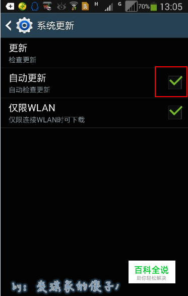 进去后大家发现有个自动更新打钩了,于是我们去掉这个勾选,这是有些型号如note3的通知栏里就没有设备更新图标了。