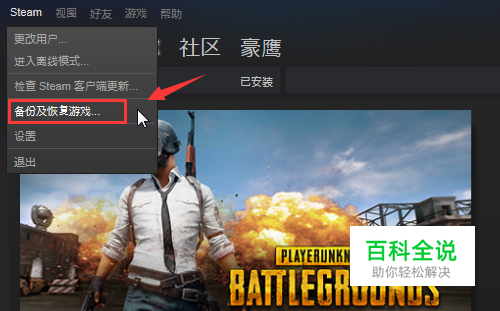 在左上方点击steam,弹出下拉菜单,点击备份或恢复游戏,如图所示