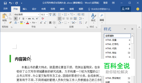 2、在打开的Word文档窗口中,选中需要清除格式的文字内容,然后在点击“开始”菜单选项卡的“样式”分区功能区的“样式”选项,在打开选项框中点击【清除格式】命令选项。如图所示;