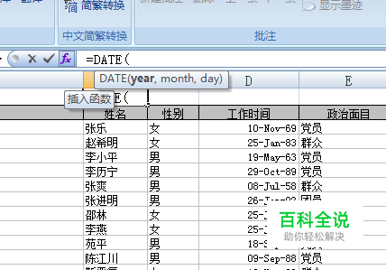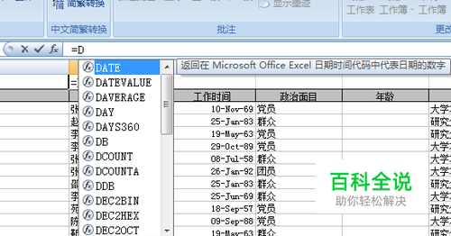 选择B1单元格,输入“=D”,选择其下方的下拉列表的【DATE】函数