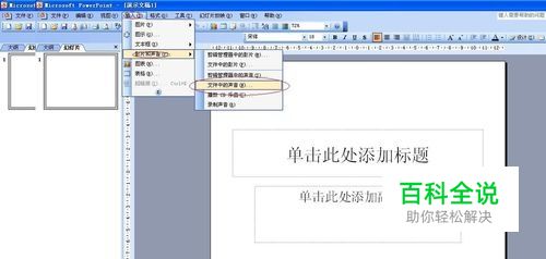 选择“插入→影片和声音→文件中的声音”选择自己要插入的音乐,点打开
