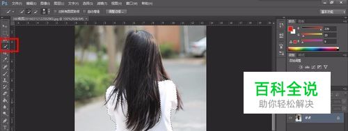 点击快速选择工具,选择美女人物背面的衣服,如下图所示选择选区。