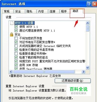 打开“Internet 选项”后,点击界面中的“高级”选项。