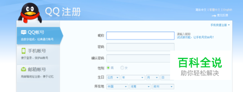 安装好QQ, 我的QQ是2014最新版. 打开QQ会出现QQ界面, 然后点击注册QQ, 然后打开注册QQ页面. 打开的是一个网页. 现在有3中注册方式. 第一种经典的注册方式. 第二种手机号注册方式. 第三种是邮箱的注册方式. 先看第一种注册方式.