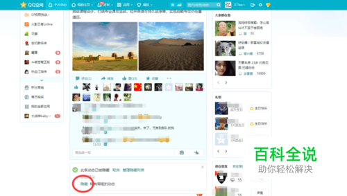 第一种方式:(快速屏蔽)打开空间,进入个人中心。咦?发现一个又在空间发广告。大家可以点击动态下面的三个小点符号“...”。会出现隐藏本动态的功能(仅限隐藏本条动态)。