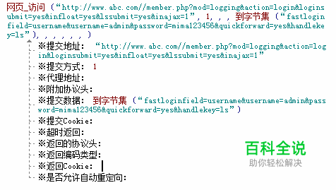 POST /member.php?mod=logging&action=login&loginsubmit=yes&infloat=yes&lssubmit=yes&inajax=1 HTTP/1.1 Accept: text/html, application/xhtml+xml, */* Referer: http://www.abc.com/ Accept-Language: zh-CN User-Agent: Mozilla/5.0 (compatible; MSIE 10.0; Windows NT 6.2; Trident/6.0) Content-Type: application/x-www-form-urlencoded Accept-Encoding: gzip, deflate Host: www.abc.com Content-Length: 88 Connection: Keep-Alive Cache-Control: no-cache Cookie: fastloginfield=username&username=admin&password=mima123456&quickforward=yes&handlekey=ls 其中比较重要的是第一行的网址,已经host、cookie、和cookie下面的数据。