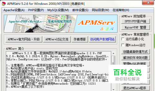 如上:APMServ5.2.6安装\解压到D盘或别的盘就可以。如文件夹里边F:\APMServ5.2.6\www\htdocs网站软件程序上传到【网站根目录"htdocs"】即可。MySQL数据库文件存放目录:MySQL5.1\data或MySQL4.0\data,MySQL默认用户名:root,密码为空 【点击启动软件后】在浏览器输入http://127.0.0.1或127.0.0.1迅雷、QQ旋风、BT等下载软件启动后默认会占用80端口,导致APMServ无法启动。解决方法:先关闭这些软件,启动APMServ。