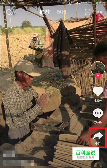 抖音中发现短视频被别人盗用有两个方法解决,第一个就是举报,在短视频播放界面点击右侧的【转发】。