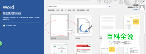 启动Word 2016文字处理应用软件,如图所示点击屏幕右侧新建空白文档。