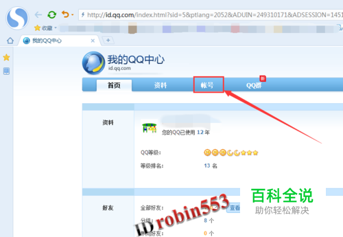 接下来会自动打开浏览器,并进入我的QQ中心页面, 点击页面中的“帐号”选项卡。