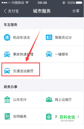 之后在支付宝的“公共支付”页面,如果我们是在高速上违章的,就点击“高速缴罚”按键。如果不是在高速上违章的,就点击“道路交通罚款”按键。