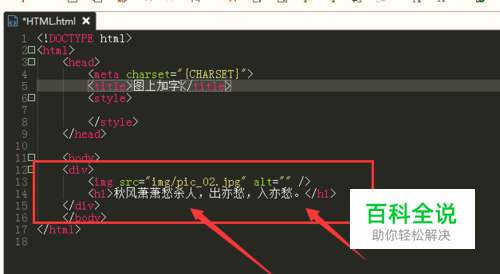在html文件中,先建立一个div,然后在里面设置一个图片和文字h1,如图所示