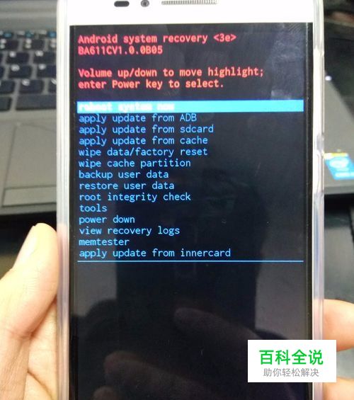 关机后,同时按手机顶部的电源键 和 侧面的音量上键,手机显示安卓机器人后,按屏幕可触摸区域下方中间位置(即开机后下方三个虚拟键中的小房子按键)进入菜单选择项。