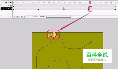 延续“引导线:小鱼”图层的帧数到第100帧。 在“小鱼”图层第100帧插入关键帧。