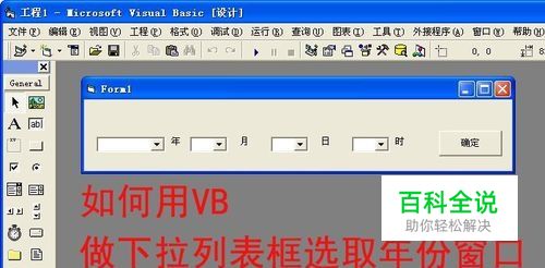 在很多软件中都有选取年份的窗口,可以用VB的编程软件来设计,那么如何用VB做下拉列表框选取年份窗口呢,其实很简单,按照以下几个基本步骤,反复操作4次,就可以把选取年、月、日、时程序的窗口做出来,大家也来做做吧。