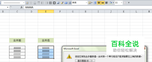 如图准备合并前数据,合并时出现“选定区域包含多重数值。合并到一个单元格后只能保留最左上角的数据”。