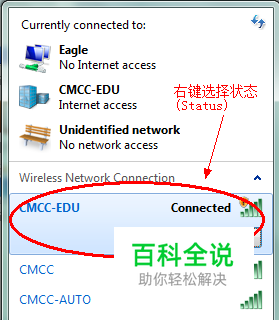 首先连接到路由器发出的wifi信号上,比如TP_LINK_ABCDEFG,然后右键选择状态(Status),如图所示:
