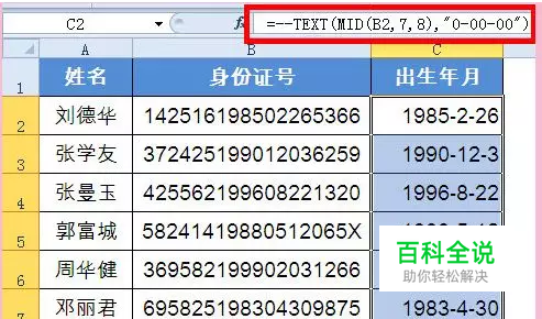 C2单元格输入以下公式,向下复制填充。 =--TEXT(MID(B2,7,8),"0-00-00")