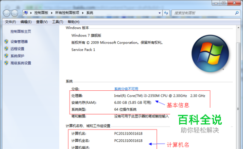 最常见的基本信息了解相信很多朋友都知道,也很习惯的会看看: "计算机"—"属性": 这里我们可以大致的了解下电脑的操作系统(系统类型)、处理器(品牌、型号、主频)、内存(这里是内存条的大小,不是硬盘)。 当然还有就是计算机名称及系统激活状态(是不是正版就暂且不说了)!
