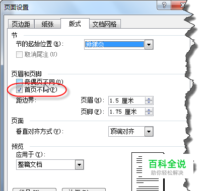 “页面设置”对话框中选择“版式”选项卡下“页眉和页脚”勾选“首页不同”