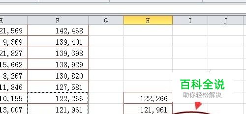 在excel表格中,我们复制其中两个单元格的数字“122,266”、“121,961”,粘贴到旁边的空白单元格中,右下角就出现了粘贴选项按钮。