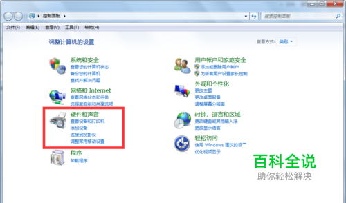 打开控制面板,找到硬件和声音选项