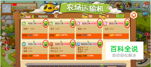 回到农场运输机,点击市级订单,已经凑齐荔枝和鹭草,点击交货,1184个点券又到手了。