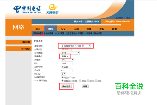 进入后,点网络-网络设置,找到业务类型为【网络】的连接名称,连接模式改为桥接,保存应用即可