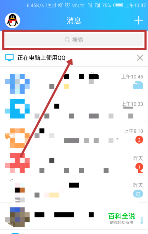 首先我们打开手机QQ,然后点击界面上方的搜索框,如图所示。