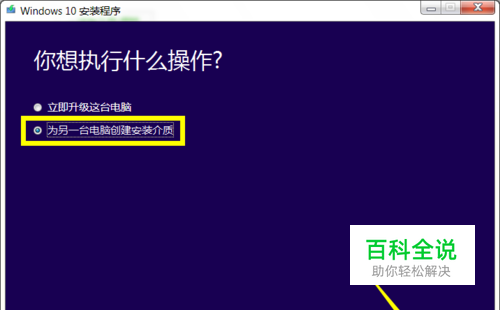 待“MediaCreationTool”工具下载完成后,安装并运行此工具,从弹出的“Windows10安装程序”主界面中,勾选“为另一台电脑创建安装介质”项,点击“下一步”按钮。