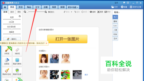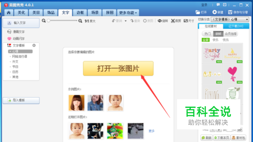 如何在图片上设置漫画文字 2025-06-12 03:49:28 美图秀秀 操作方法 01 打开美图秀秀,点击文字 02 选择打开一张图片。 03 选择自己要编辑的图片,打开。 04 选择漫画文字 05 选择右侧的漫画文字,文字编辑器中输入文字,下面可以设置旋转、大小 06 点击保存。 赞 (0) 相关推荐 怎么在图片上批量添加文字 怎么在图片上批量添加文字 操作方法 01 打开我们电脑里面的2345看图王的软件 02 点击上边的批量处理的按钮,如图所示 03 点击下边的批量添加文字的按钮 04 在左侧我们找到添加文件的按钮,直接 ... 在ppt的图片上如何加入文字? 在我们日常生活里的很多方面都会用到一些常见的办公软件,ppt也是十分普遍的.所以我们就必须掌握一些简单的ppt制作技巧.今天我们一起来看看如何才能在ppt的图片上加入文字吧. 步骤 1.首先打开我们p ... 如何给word文档中的箭头上设置显示文字 我们在使用Word文档编辑文档的时候,想要在插入的箭头中显示文字,该怎么操作呢?今天就跟大家介绍一下如何给word文档中的箭头上设置显示文字的具体操作步骤.1. 首先打开电脑上的Word文档,进入编辑 ... 不用ps等软件简单去除图片上的水印文字 发现很好看的图片,想下载下来,但是下下来一看,却有水印什么的,看着不好,今天小编教大家一种很简单的方法,来处理一些简单的图片,去除图片上的一些文字,只要电脑能够编辑图片就可以进行了,不需要什么ps,美 ... 用手机在微信聊天的图片上直接加文字和指引技巧 用手机在微信聊天的图片上直接加文字和指引的技巧.下面就介绍一下. 操作方法 01 生活中经常用微信聊天,时不时就发一些图片.相片这类的东西.有时候别人看图片中的东西看的不是很懂.说了半天还是不明白,事 ... Photoshop教程:如何快速去掉图片上的水印文字 如果需要使用的图片素材带有文字水印,那我们就可以用Photoshop轻松将文字水印去除 操作方法 01 使用Photoshop打开带有文字水印的图片 02 选择使用"矩形选框工具" ... wps图片上如何添加文字水印 wps文字给图片添加文字水印的方法 新建好的word文档或者wps文字,找到插入-水印-点击添加 勾选 图片,然后选择图片,把自己想要设为水印的备用图片添加进去,然后点击"确定", ... Excel表格在插入的图片上怎么添加文字 Excel表格如何在插入的图片上添加文字呢?下面小编为大家讲解一下Excel表格在插入的图片上添加文字的方法;一起去看看吧! 方法: 1.在电脑上创建一个Excel. 2.创建后,我们点击上方的&qu ... PS图片上怎么插入文字 在图片上添加文字,能让你的图片意思表达得更加直观. 操作方法 01 在photoshop中打开你要进行加字操作的图片 02 单击"文字工具"(左边工具栏像T字符号那个),并点击右键 ...