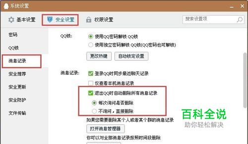 先点击上方的安全设置,再点击左边的消息记录,然后在右边的退出qq时自动删除所有消息记录前面的方框里打勾,如果您不需要系统提醒您,可以选择下面的不询问,直接删除。
