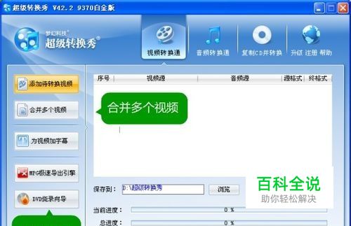 使用综合性音视频转换软件《超级转换秀》,导出各种主流视频格式 导入待转换的视频 点击“添加待转换视频”按钮,即可导入视频。除了视频转换,软件还支持合并多个视频,为视频加字幕以及刻录DVD的功能。