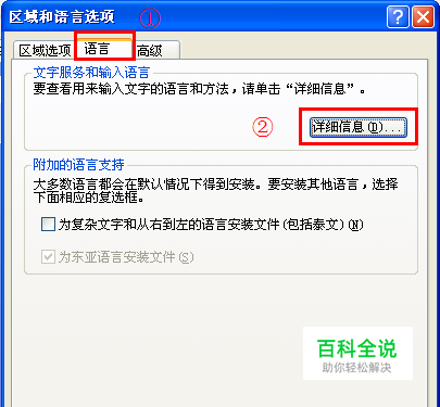 单击“语言”标签下的“详细信息”,再单击“高级”,把“关闭高级文字服务”前的钩去掉