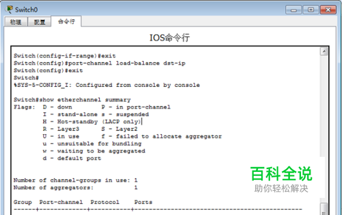 配置交换机Switch0: Switch>en Switch#conf Switch(config)#interface range fa0/1-2 Switch(config-if-range)#switchport mode trunk //设置端口模式为trunk Switch(config-if-range)# Switch(config-if-range)#channel-group 1 mode on //加入链路组1并开启 Switch(config-if-range)# Switch(config-if-range)#exit Switch(config)#port-channel load-balance dst-ip //按照目标主机IP地址数据分发来实现负载平衡 Switch(config)#exit Switch#show etherchannel summary