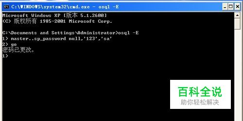 命令只有二个,严格来说,只有一个,很简单。 1、输入:master..sp_password null,'123','sa' 要注意区分大小写哦,输完后回车,如图,没提示就是正确的了。 在此说明一下,命令的功能是将sa超级管理员的密码设置为:123,如果你想改其他其他密码,请替换命令行中的:123即可。