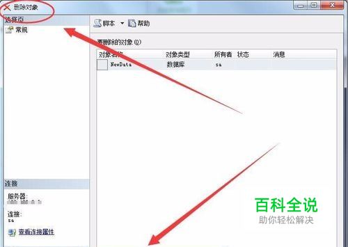 删除对象窗口中,选择删除数据库备份和还原历史记录信息选项,同时选择关闭现有连接选项,单击确定。